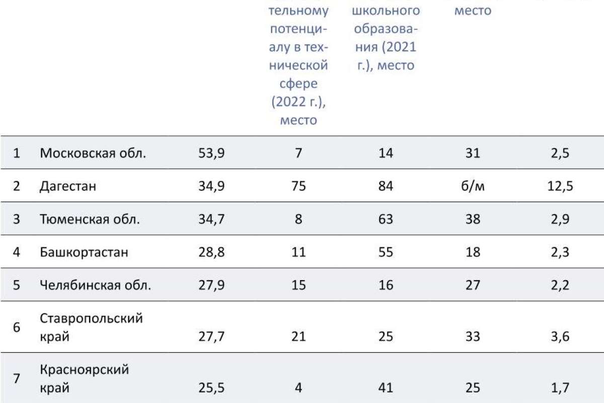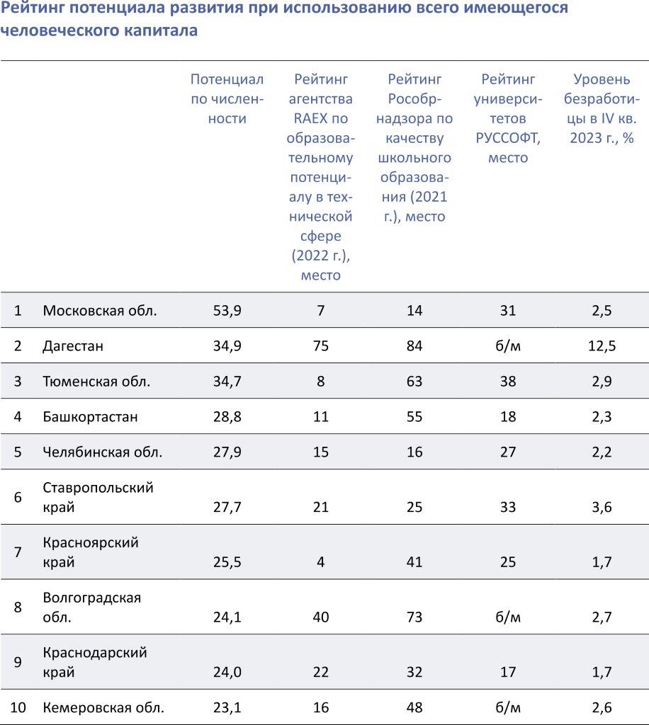 Если исключить из рассмотрения Московскую обл., то на первом месте в этом рейтинге оказывается Дагестан. При этом у региона высокий уровень безработицы. Действительно, потенциал у Дагестана самый высокий, но при этом низкий уровень школьной подготовки. Поэтому реализовать этот потенциал региону можно в лучшем случае лет через