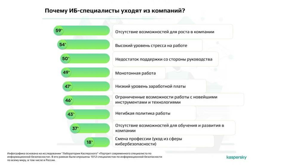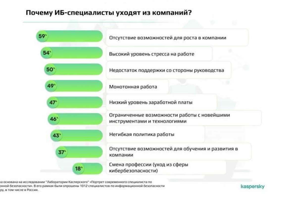 Наиболее распространённой причиной покинуть компанию сотрудники отделов кибербезопасности называют отсутствие возможностей для карьерного роста. Об этом сообщили 59% участников глобального опроса* «Лаборатории Касперского».