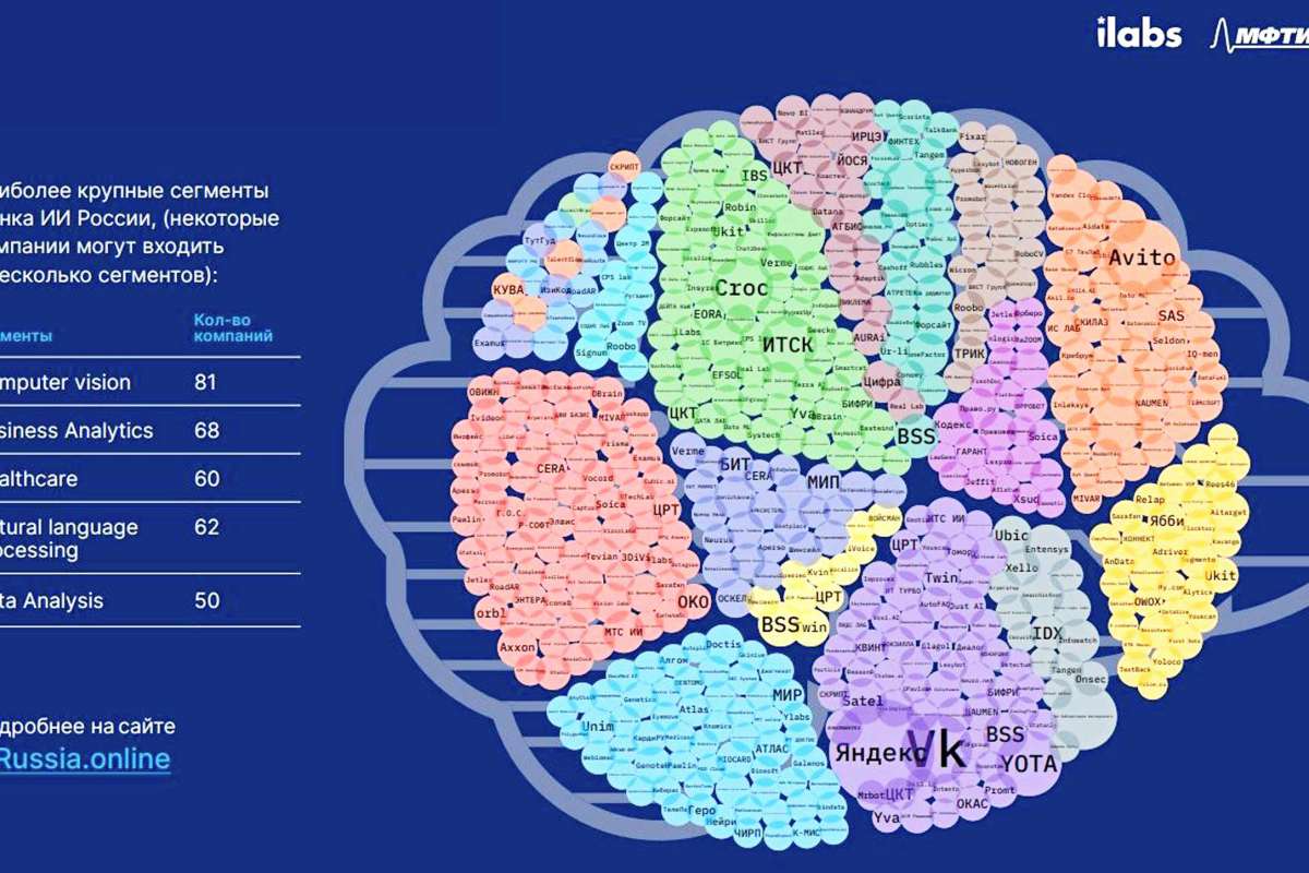 Эта оценка содержится в Аналитическом сборнике № 13 (альманах «Искусственный интеллект. Индекс искусственного интеллекта в России»), подготовленном Центром компетенций Национальной технологической инициативы по направлению «Искусственный интеллект» на базе МФТИ и обнародованном в декабре 2024 г. Там же содержится ссылка на интерактивную карту (рис. 1), в которой можно найти названия этих компаний.