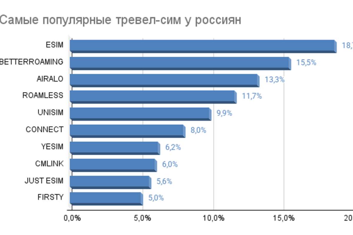 На первом месте среди туристических eSIM оказался одноименный тревел-оператор Esim.io — его выбирают почти 19% пользователей, которые используют модуль Unisimka. По данным оператора Esim.io, активировать профиль можно в 160 странах мира. Второе место заняла компания BetterRoaming (15%), замыкает тройку лидеров один из самых популярных тревел-операторов — Airalo с 13% пользователей. Сим-карту этого оператора можно подключить практически в любой стране, включая даже непопулярные направления для туризма.