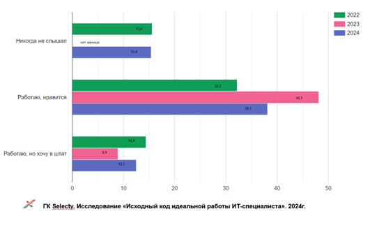 «Опрос показал, что сегодня программисты проявляют интерес к работе через вендоров, — считает Дарья Кудрявцева, директор по персоналу ГК Selecty — Такие организации „заточены“ на ИТ-специфику, поэтому быстро реагируют как на запросы рынка, так и на пожелания и „боли“ персонала. В 2024 году по подобной схеме работали почти 40 % — это меньше, чем в прошлом, но, видимо, мы видим консенсусную долю за счет стабилизации рынка труда, которая сохранится на ближайшую перспективу. Благодаря гибкости и возможности быстрой внутренней трансформации вендоры способны идти на определенные компромиссы с желаемым соискателем, поэтому и вовлечь людей в корпоративную среду им легче. В сочетании с современными технологиями взаимодействия и управления это также становится фактором выбора места работы для квалифицированного специалиста и повышает эффективность и управляемость команд».