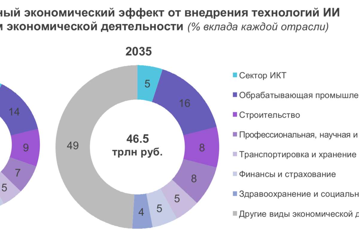 Основной вклад в создание экономического эффекта от использования ИИ в 2035 г. будут приносить такие шесть отраслей, как: обрабатывающая промышленность (7,7 трлн руб.), строительство (4 трлн), профессиональная, научная и техническая деятельность (3,7 трлн), транспортировка и хранение (2,6 трлн), финансы и страхование (2,5 трлн), здравоохранение и социальные услуги (1,7 трлн руб.). Примечательно, что в секторе ИКТ , играющем ключевую роль в развитии технологий ИИ, экономический эффект от их использования будет относительно небольшим (2,2 трлн руб. в 2035 г.).