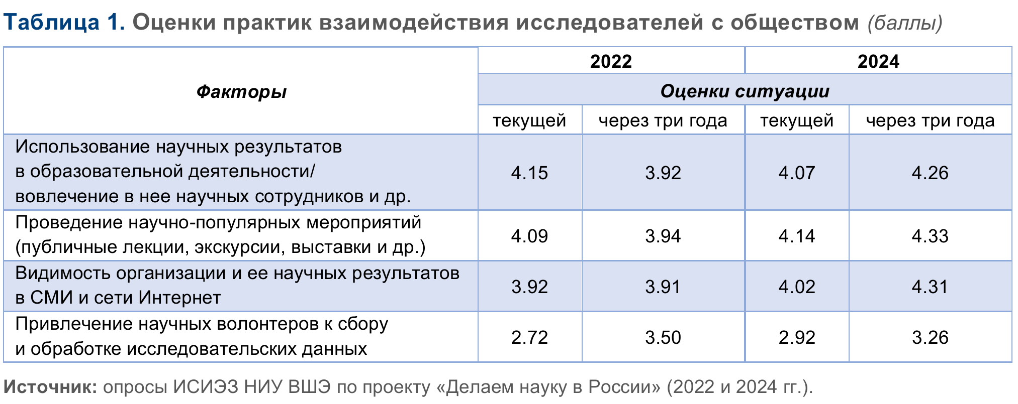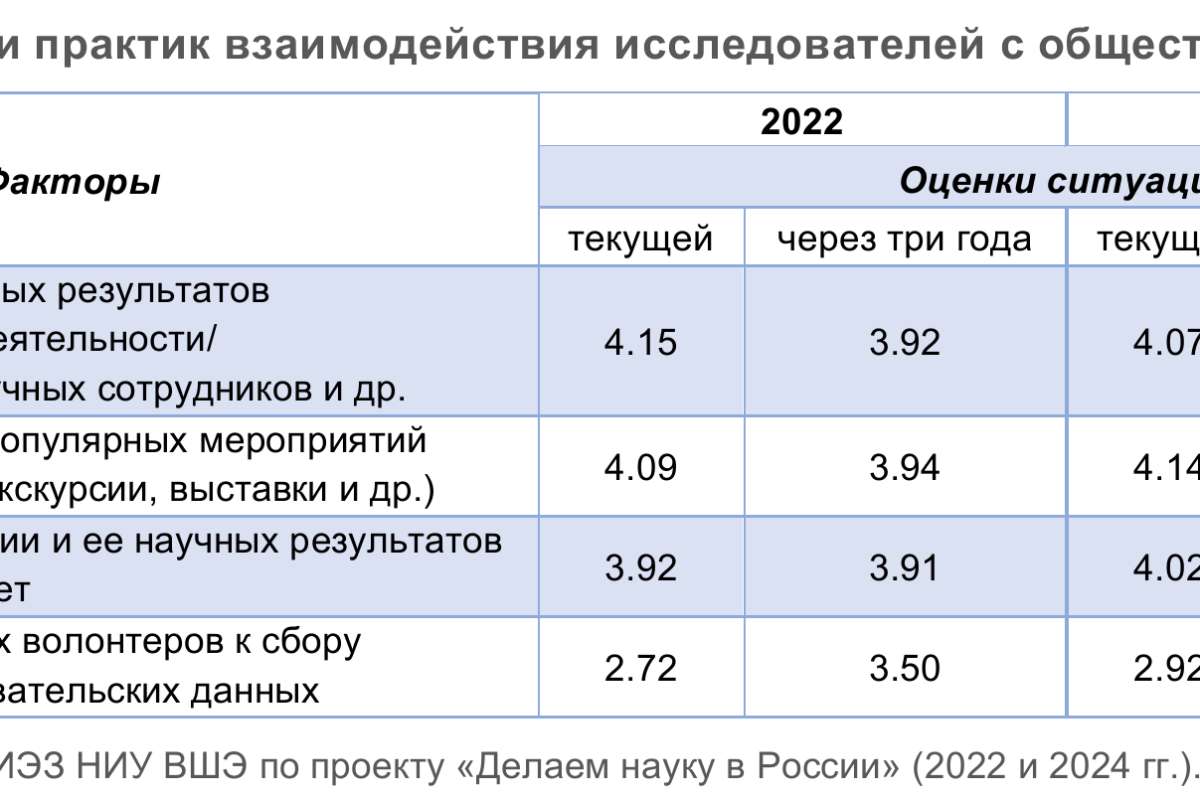 Комментирует Ольга Славинская, ведущий эксперт Центра научно-технической, инновационной и информационной политики ИСИЭЗ НИУ ВШЭ: «Укрепление связей с обществом определенно оптимизирует деловой климат в науке, в чем убеждают результаты новой волны исследования „Делаем науку в России“. Среди ученых все больше тех, кто видит смысл в том, чтобы делиться своими знаниями и экспертизой не только с академическим сообществом, но и с широкой общественностью, и готов это делать, осваивая как традиционные, так и новые способы представления полученных результатов, например: рассказывать о них в СМИ, выступать с публичными лекциями, вести персональные блоги и т. п. Во многих ведущих вузах и научных организациях руководство всячески поддерживает просветительскую деятельность ученых и привлекает, в том числе на штатной основе, специалистов в сфере коммуникаций, которые помогают командам исследователей адаптировать сложную научную информацию и выстраивать диалог с разными группами населения. Данный тренд усиливают и различного рода и масштаба инициативы, которые запускают высокотехнологичный бизнес и государство. Среди последних особую роль играют „Десятилетие науки и технологий“ и федеральный проект „Популяризация науки и технологий“, нацеленные на то, чтобы сделать достижения науки понятнее обществу и одновременно повысить престиж исследовательской карьеры. Обратная связь от граждан, в частности получаемая в рамках волонтерских практик, дает ученым новые идеи, ценные данные и другие ощутимые результаты».