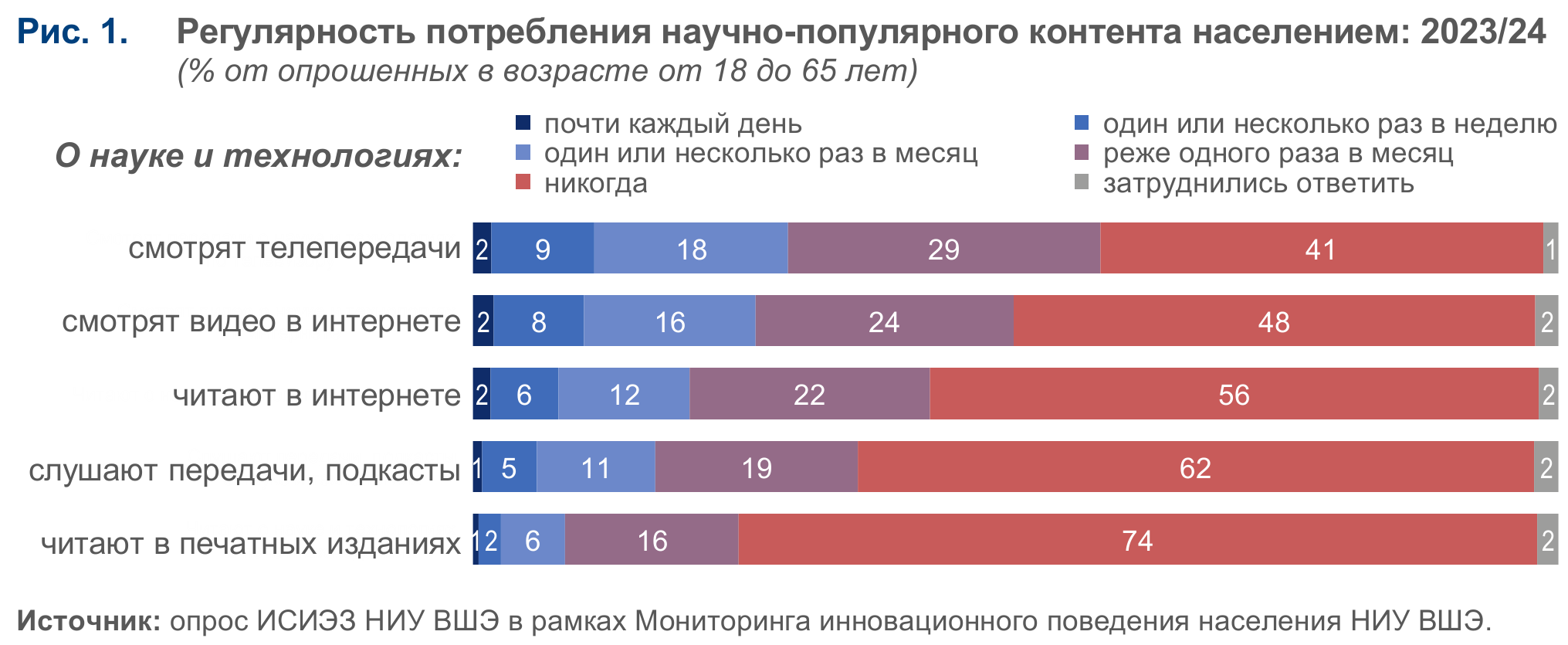 Данные другого опроса ИСИЭЗ НИУ ВШЭ, проведенного в рамках Мониторинга инновационного поведения населения, демонстрируют, что в России сложилась постоянная аудитория потребителей научно-популярного медиаконтента: 17% респондентов в возрасте