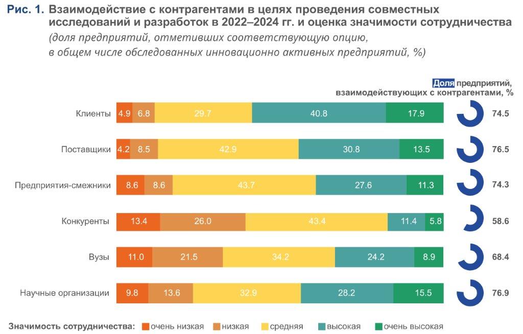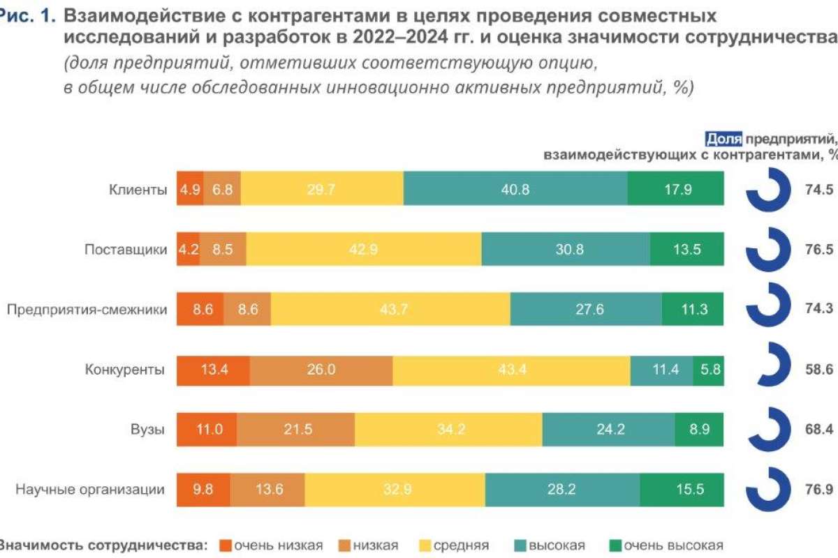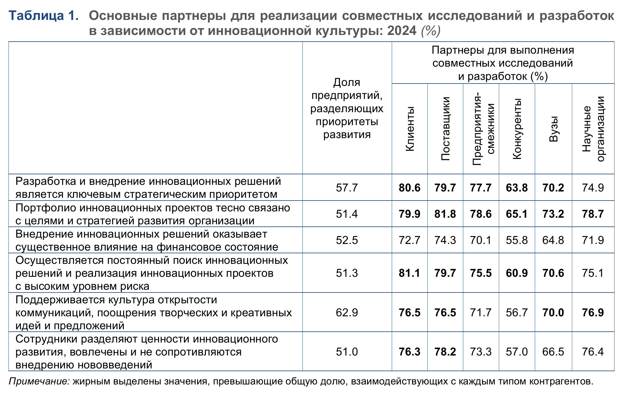 Вне зависимости от типа партнера в совместном выполнении исследований и разработок преимущественно заинтересованы предприятия, нацеленные на максимально активное использование внешних каналов получения информации и идей, для которых инновации — стратегический приоритет, а портфели инновационных проектов тесно связаны с целями развития. Кроме того, взаимодействие с контрагентами способствует диверсификации рисков отрицательных результатов научно-исследовательских проектов и разработок, а также стимулирует интерес к кооперации со стороны предприятий, регулярно осуществляющих высокорисковые инновационные проекты.