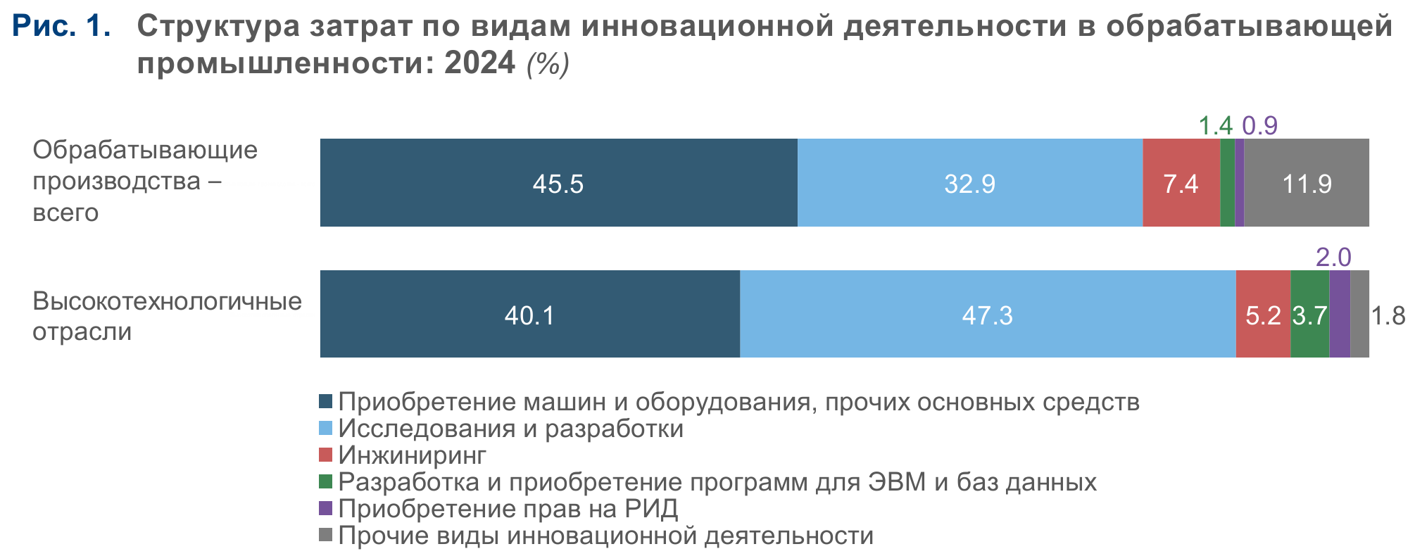 Соотношение затрат на основные виды инновационной деятельности заметно варьирует в отраслевом разрезе. Так, в высокотехнологичных секторах приоритетами при реализации инноваций являются ИР (47,3% общих инновационных затрат), тогда как на обновление материально-технической базы направляется около 40% средств (рис. 2.)