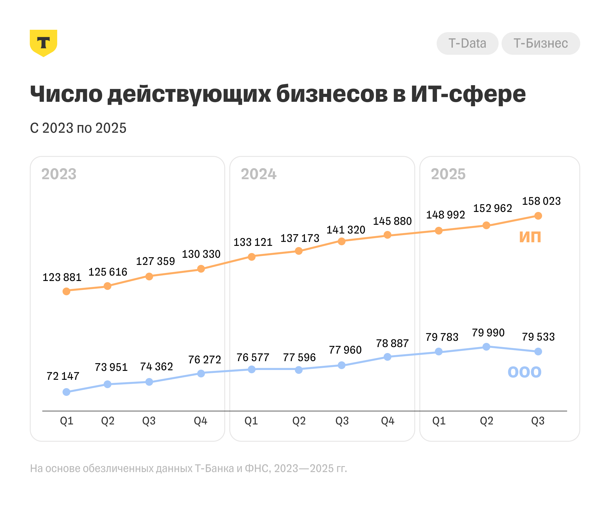 В исследовании учитывались открытые данные ФНС о 239 973 бизнесах, а также обезличенные данные ИП — клиентов Т-Бизнеса. Каждый четвертый ИТ-предприниматель в стране регистрируется через Т-Бизнес. Сравнивались показатели с августа 2023 по август 2025 года.