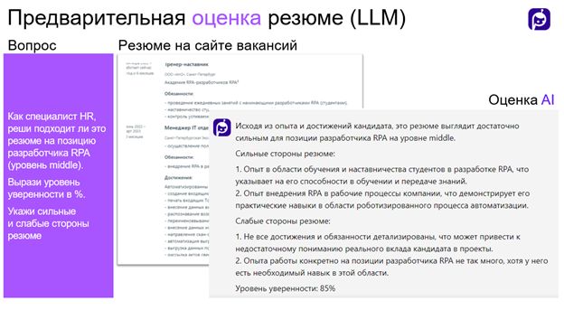 На этом этапе подключается языковая модель. Она не просто ищет совпадения по ключевым словам, а читает резюме как человек. Учитывает смежный опыт, стиль изложения, формулировки — и делает вывод, насколько кандидат подходит на вакансию.