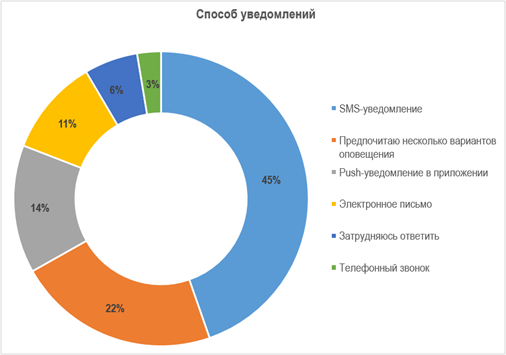 В качестве предпочтительного способа уведомления о списании средств почти половина (45%) пользователей выбрали SMS-оповещения, пятая часть (22%) предпочитает получать несколько видов уведомлений одновременно, 14% выбрали push-уведомления в приложении.