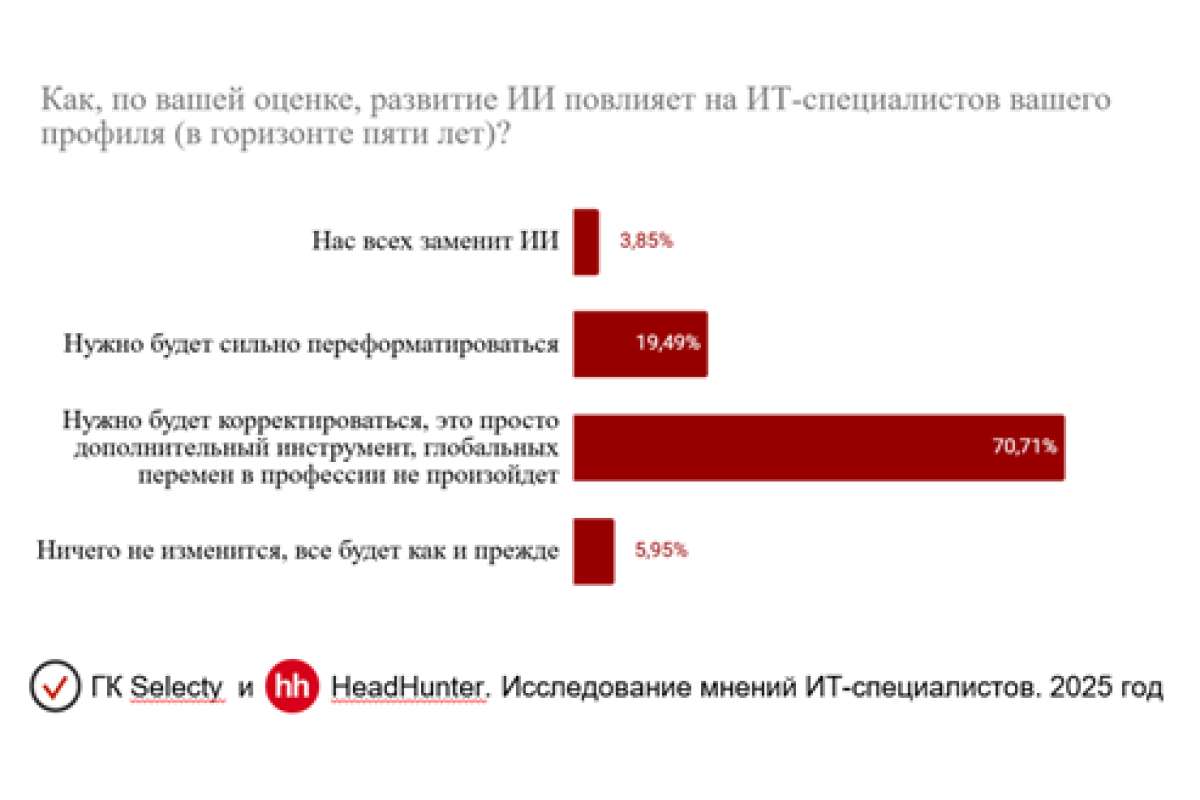 ИТ-специалисты никогда не видели угрозы в ИИ. Согласно данным совместного исследования компании Selecty и платформы hh.ru, 70% воспринимают его как инструмент, и в том числе собственного развития. Среди ИТ-специалистов, готовых пройти переквалификацию, 89% опрошенных заинтересованы в повышении компетенций именно в сфере искусственного интеллекта. (рис. 1)