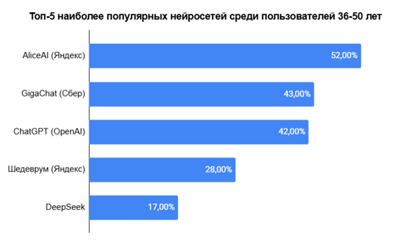 Anketolog.ru провел исследование и выяснил, как меняются предпочтения в использовании нейросетей в зависимости от возраста пользователя. Опрос показал, что молодежь до 35 лет чаще выбирает ChatGPT (64%), Алису AI (46%) и DeepSeek (40%), тогда как пользователи старше 51 года отдают предпочтение GigaChat (54%).