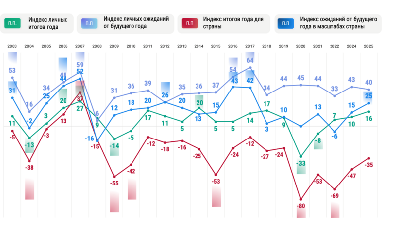 В оценках прошедшего года для России в целом по-прежнему доминирует пессимизм: в 2025 году индекс итогов года для страны составляет −35 пунктов, что заметно лучше экстремально низких значений 2020 года (−80 пунктов) и 2022 года (−69 пунктов), но все еще говорит о преобладании восприятия года как трудного и тяжелого.