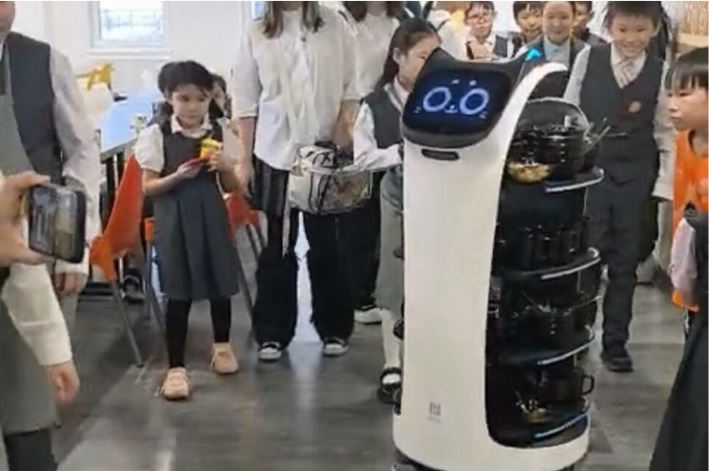BellaBot, симпатичный робот с большими экранами-глазами, ловко маневрирует между столами, помогая ученикам-дежурным разносить подносы с едой.
