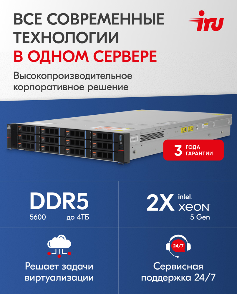 5-го поколения и оперативной памятью формата DDR5 5600, объёмом до 4 терабайт. Благодаря этим характеристикам он подходит для широкого списка использования в качестве файлового сервера или контроллера домена, таких как виртуализация, сервер базы данных, терминальный сервер.Для клиентов бренда действует четырёхуровневая сервисная программа «iRU рядом», обеспечивающая быструю круглосуточную поддержку с опциями удалённой диагностики и выезда инженера на территорию эксплуатации устройств.