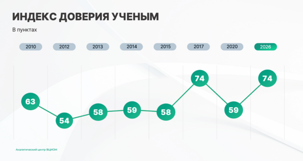 - Индекс доверия ученым в 2026 г. равен 74 п. (+15 п. к 2020 г.).
