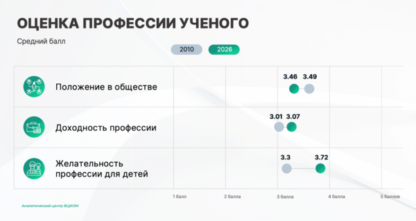 - С 2010 г. представления о положении ученых в обществе (2010 г. — 3,49 балла из 5; 2026 г. — 3,46 б.), а также о доходности профессии (2010 г. — 3,01 б.; 2026 г. — 3,07 б.) практически не изменились.