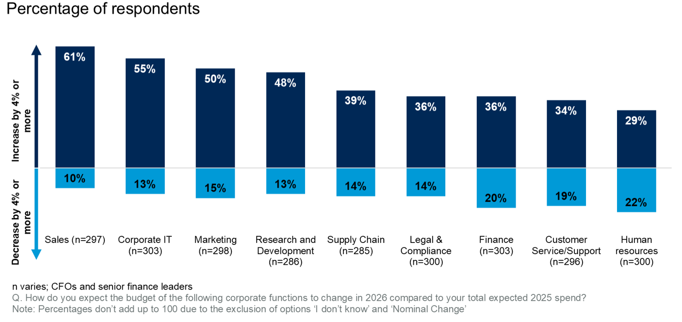 «Наибольший рост бюджетов в 2026 году ожидается в продажах и ИТ: более половины CFO планируют увеличить расходы, а 28% прогнозируют двузначный рост в обеих областях. Маркетинг идёт следом, — отметил Науман Аббаси, вице-президент и аналитик Gartner в практике финансов. — Фокус на продажах и маркетинге отражает их роль как драйверов роста, а увеличение ИТ-бюджетов связано со структурными факторами: ростом затрат на SaaS, цифровизацией процессов и расходами на ИИ».