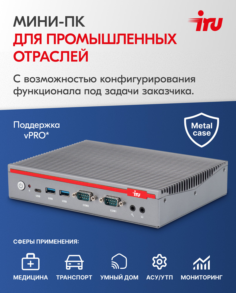 Среди последних инновационных решений iRU можно привести Промышленный ПК для задач различных отраслей. Данное устройство характеризуется высокой надёжностью, бесшумностью работы в условиях повышенных нагрузок, прочным металлическим корпусом и эффективной системой охлаждения.