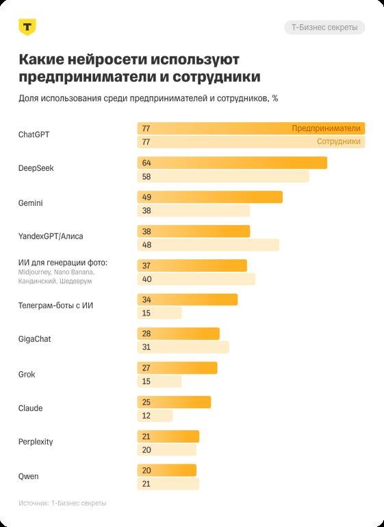 Издание «Т-Бизнес-секреты» провело исследование и узнало, какой процент малого и среднего бизнеса в России на самом деле использует ИИ и сколько денег тратит на нейросети ежемесячно. Для этого опросили более 400 предпринимателей и наемных сотрудников — клиентов Т-Банка. Полная версия исследования доступна на сайте.