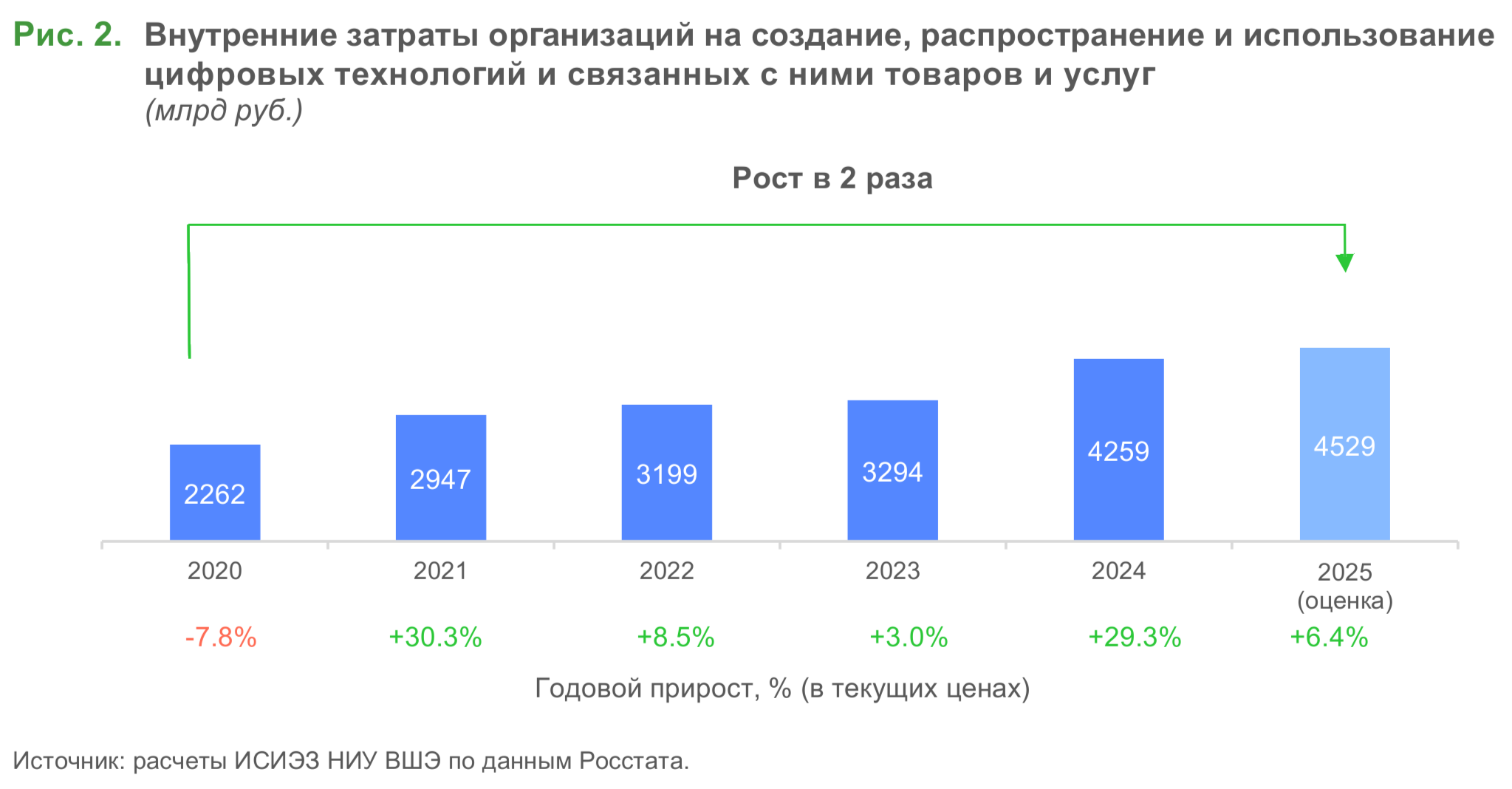 По оценке ИСИЭЗ НИУ ВШЭ, в 2025 г. положительная динамика сохранялась, но годовой прирост меньше — порядка 6% (в текущих ценах) (рис. 2). В числе причин замедления — эффект высокой базы 2024 г., а также снижение в 2025 г. среднего курса доллара на 10% (относительно уровня 2024 г.), что повлияло на стоимость импортируемого ИКТ-оборудования.