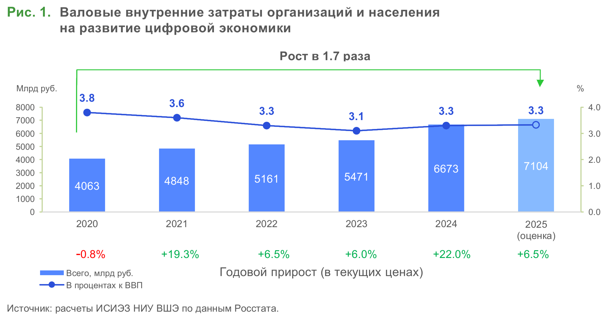 Вложения в цифровую экономику в 2025 г., по предварительной оценке ИСИЭЗ НИУ ВШЭ, составят 7,1 трлн руб. (+6,5% к уровню 2024 г.).