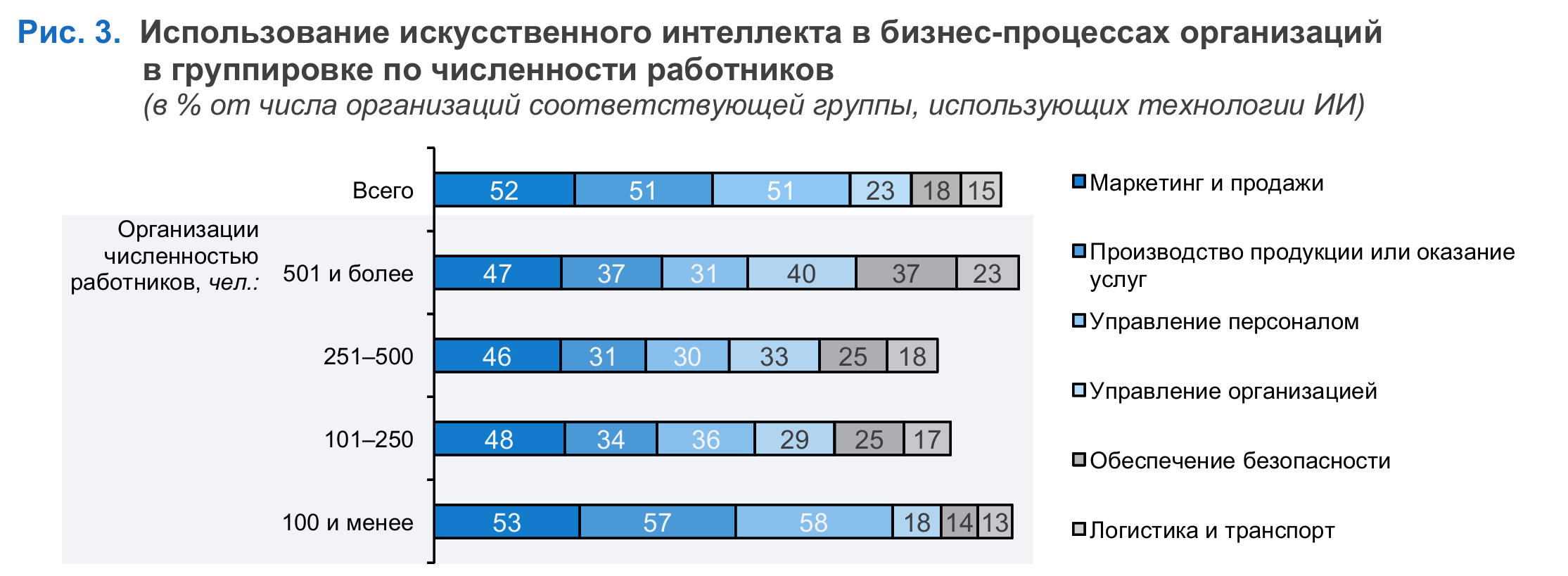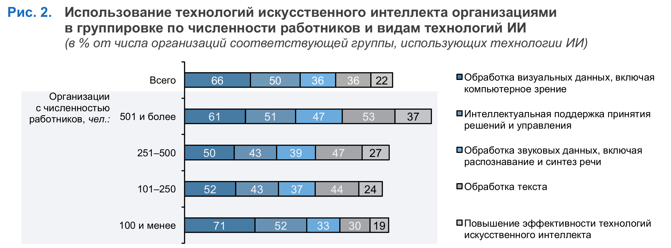 251–500, 101–250, 100 и менее человек.Ранее были представлены показатели использования ИИ в организациях в целом, вне зависимости от размера.