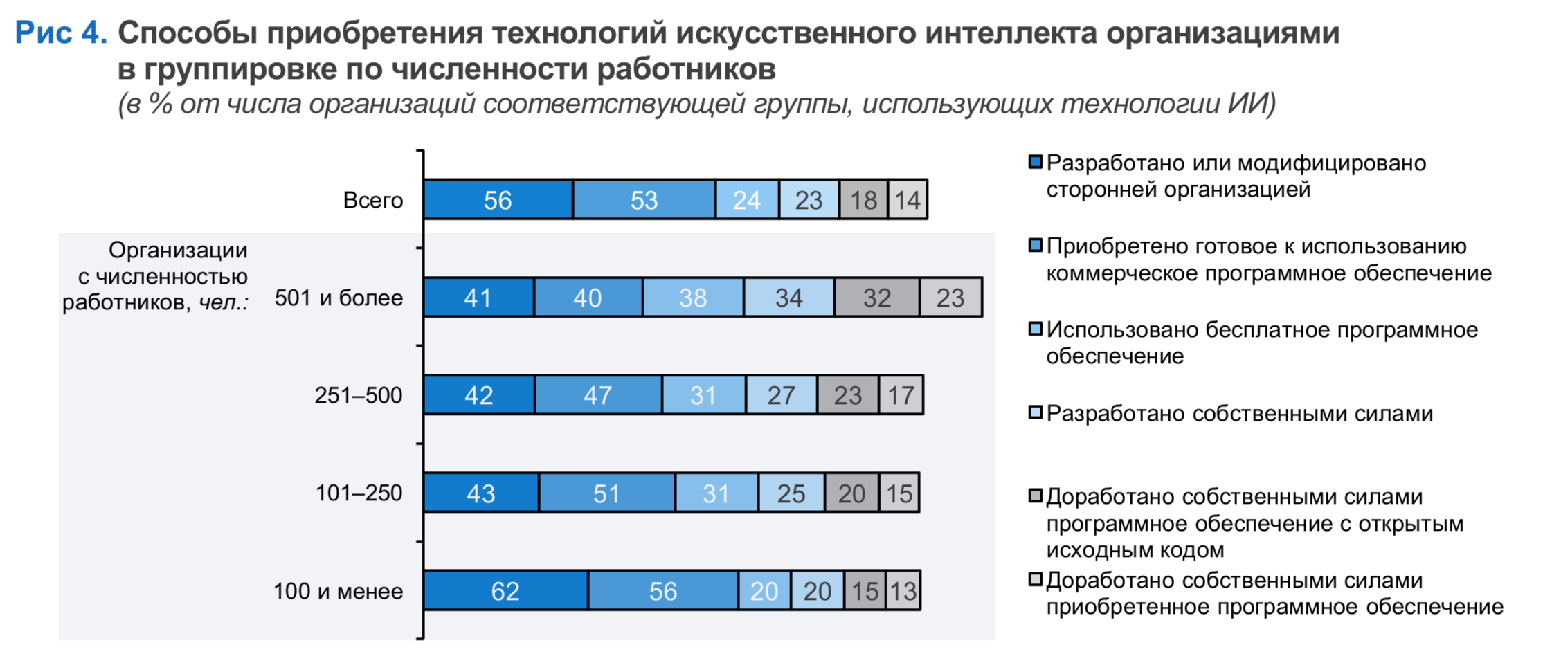 Самые распространенные способы получения необходимых ИИ-решений — заказные разработки технологий ИИ (56%), а также приобретение готового к использованию коммерческого ПО (53%) (рис. 4).