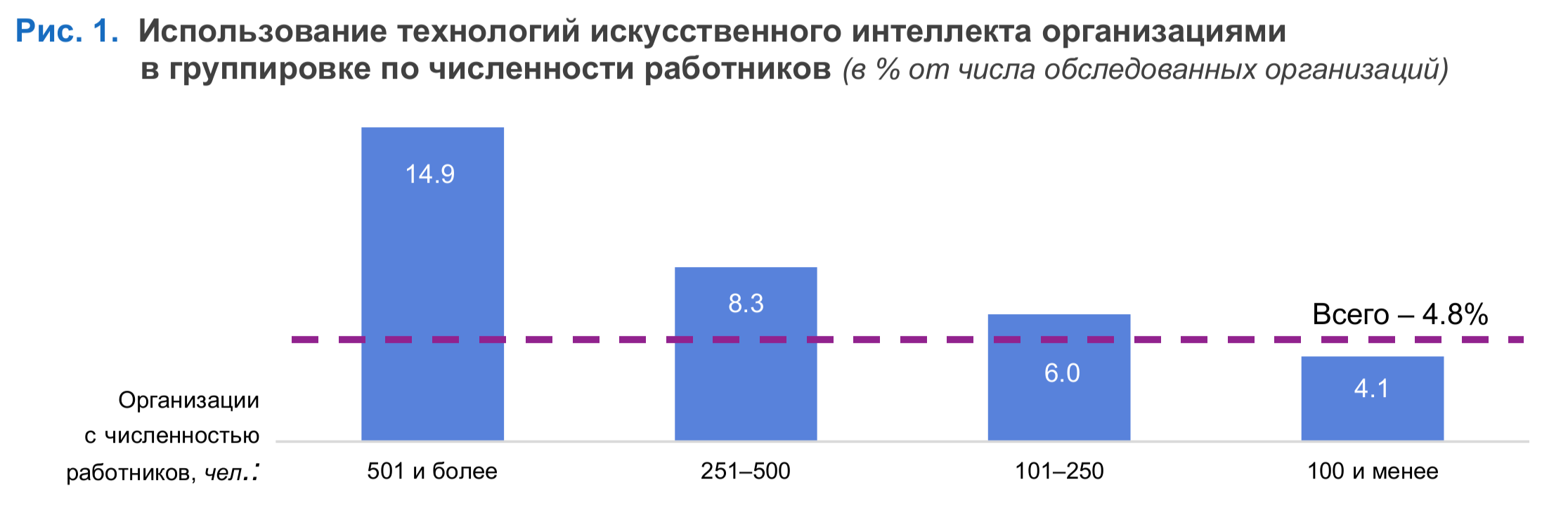 Средняя доля организаций, использующих технологии ИИ, составляет 4,8%. При этом значения в группах с максимальной (более 500 человек) и минимальной (100 и менее человек) численностью работников различаются в 3,6 раза (14,9% и 4,1% соответственно) (рис. 1).