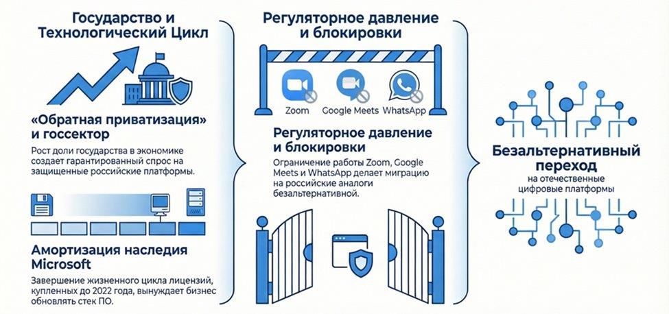 - «Обратная приватизация»: усиление государственного участия в экономике и расширение госсектора формирует гарантированный спрос на защищенные отечественные платформы.