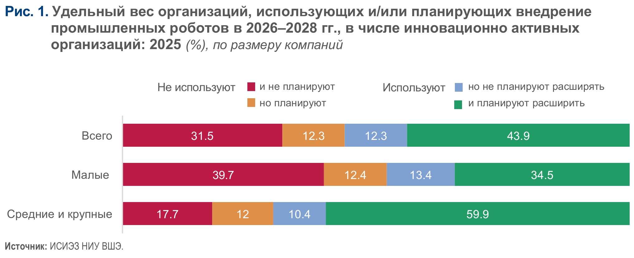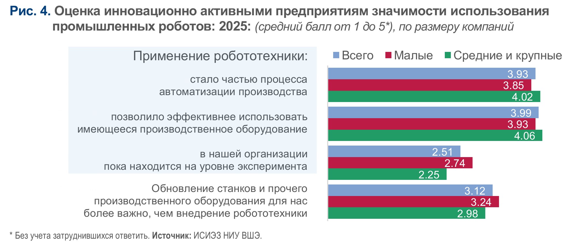 Инновационно активные компании, использующие промышленных роботов, существенно повышают эффективность эксплуатации имеющегося производственного оборудования, а робототехника становится частью процесса автоматизации производства (рис. 4). Данный эффект не зависит от размера предприятия.