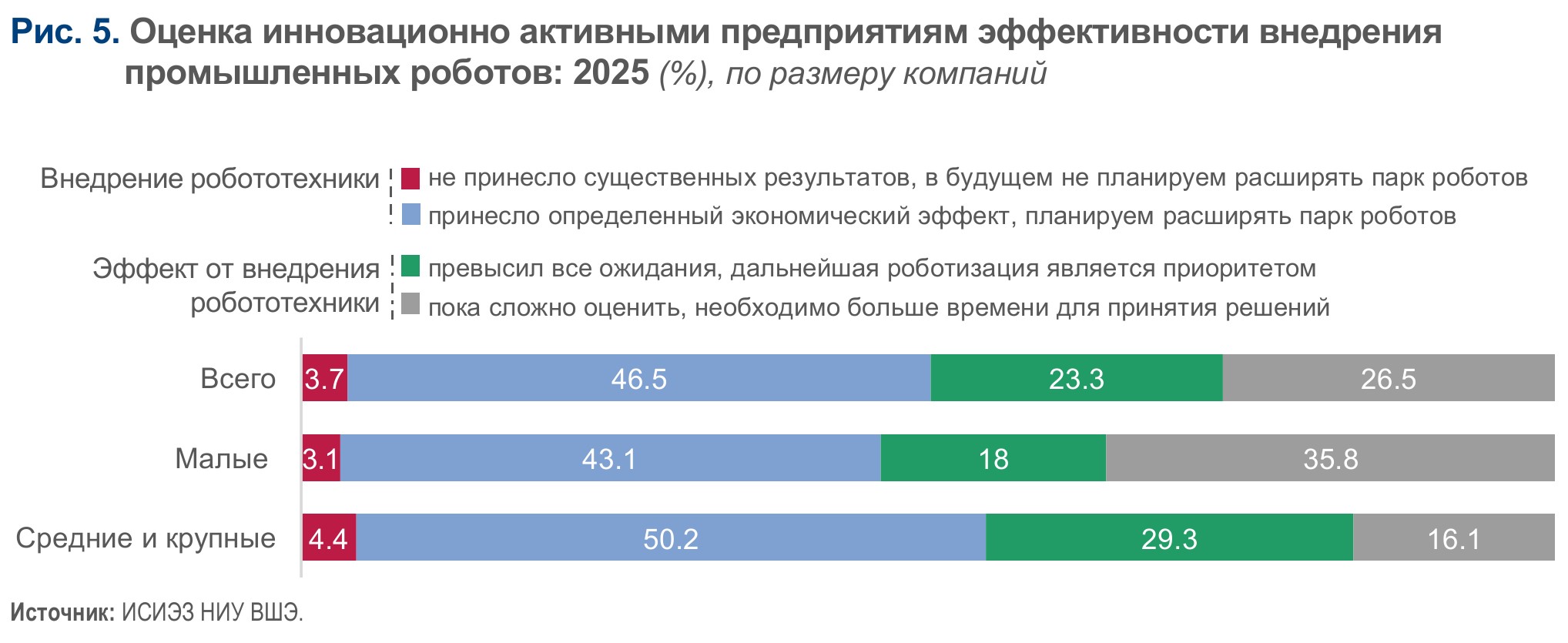 Семь из десяти инновационно активных предприятий, использовавших промышленных роботов (69,8%), ответили, что внедрение робототехники принесло им определенный экономический эффект, который примерно в каждом третьем случае превысил ожидания и сделал дальнейшую роботизацию приоритетом (рис. 5). Вместе с тем каждая четвертая компания (26,5%) оказалась пока не готова оценить эффект, причем среди малых предприятий доля таких организаций вдвое выше, чем среди средних и крупных (35,8% против 16,1%). Крайне мало предприятий разочаровались в применении робототехники в связи с отсутствием существенных результатов от ее внедрения