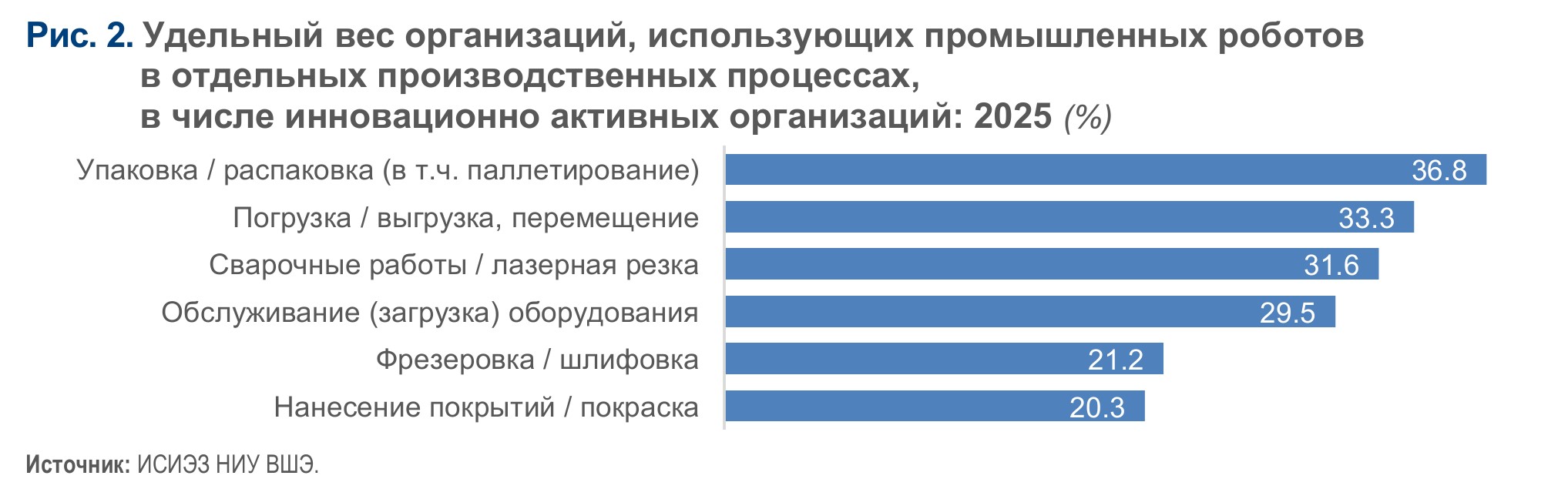 Наиболее востребованными процессами для применения промышленных роботов инновационно активными предприятиями (рис. 2) стали упаковка и распаковка (включая паллетирование) продукции (36,8%), ее погрузка и выгрузка (33,3%), а также проведение сварочных работ и лазерной резки (31,6%).