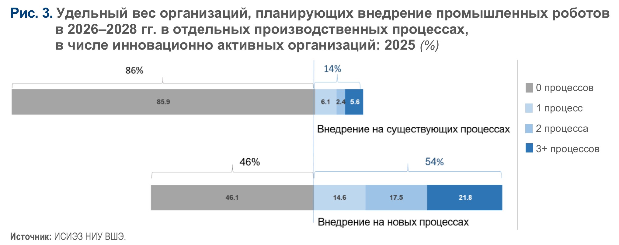 Большинство предприятий планируют расширять применение промышленных роботов преимущественно не в тех процессах, где они уже эксплуатируются, а внедрять их в новые направления (рис. 3). Так, расширить использование промышленных роботов хотя бы в одном производственном процессе, в котором они уже внедрены, собирается лишь каждая седьмая инновационно активная организация, а внедрить их в новые направления — каждая вторая (53,9%). Более того, если применение роботизированных решений в одном новом производственном процессе планируют 14,6% компаний, то в двух процессах — уже 17,5%, а в трех и более — 21,8%. Таким образом, масштабирование промышленных роботов может происходить экстенсивно.