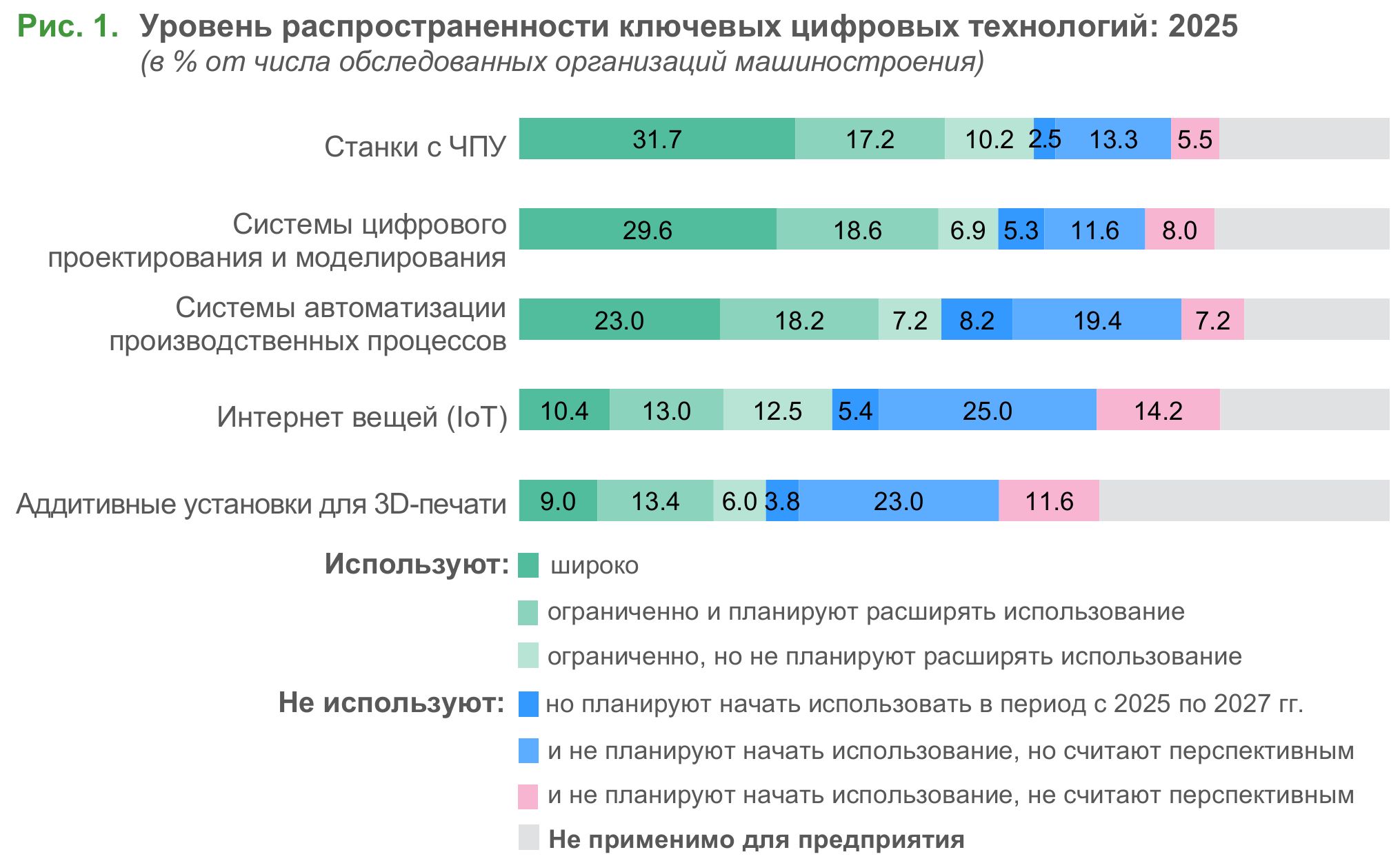 На фронтире цифровой трансформации самого машиностроения находятся станки с ЧПУ, эту технологию интегрировали суммарно 59% компаний, из них каждая вторая применяет широко, каждая третья — ограниченно, но планирует масштабировать, каждая шестая — ограниченно и не планирует расширять (32%, 17% и 10% от всех обследованных соответственно) (рис. 1). На некоторых типах производства уровень распространенности станков с ЧПУ превышает средний: например, среди производителей компьютеров, электронных и оптических изделий (64%), машин и оборудования, не включенных в другие группировки (66%), прочих транспортных средств и оборудования (60%).