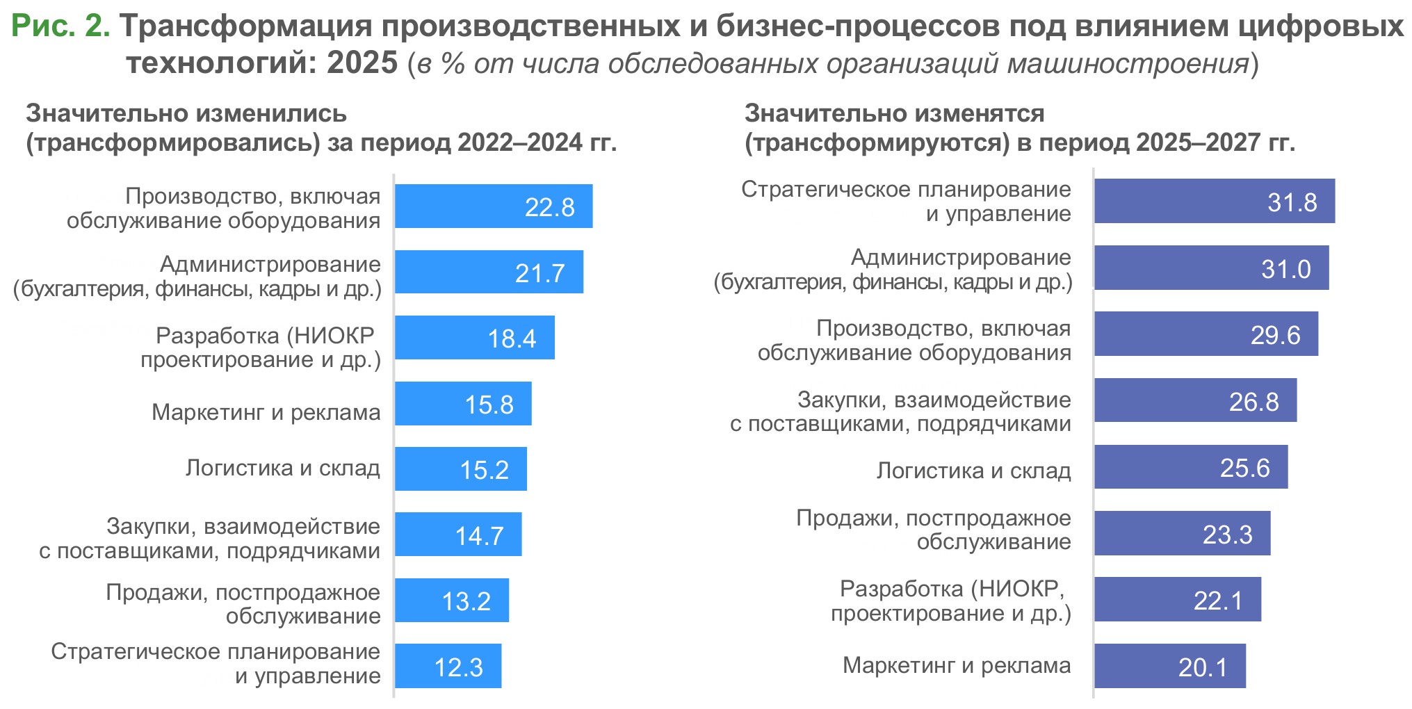В ближайшие три года (с 2025 по 2027 гг.) обследованные предприятия прогнозируют существенный рост темпов трансформации бизнес-процессов под влиянием цифровых технологий, при этом ее фокус может сместиться на управленческий уровень. В приоритеты выходят стратегическое планирование и управление (изменений в этой сфере ожидают 32% компаний) и администрирование (31%). В производстве (30%) сохранится высокая интенсивность цифрового обновления. Рост интереса к автоматизации логистики (до 26%) указывает на стремление предприятий отрасли к глубокой оптимизации ресурсных потоков.