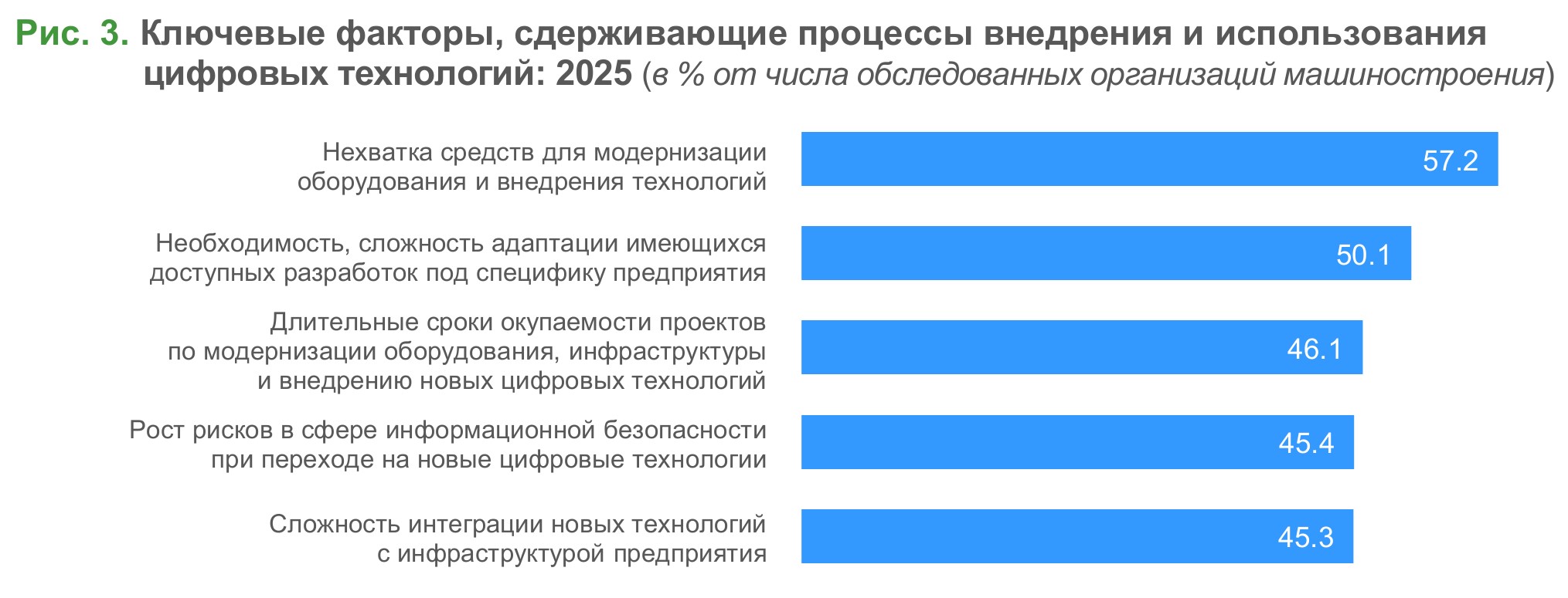 Среди барьеров внедрения цифровых технологий доминируют ресурсные и инфраструктурные ограничения. Основным препятствием является нехватка свободных средств: о дефиците бюджета на модернизацию, обновление технологий и развитие инфраструктуры сообщили 57% обследованных организаций (рис. 3).