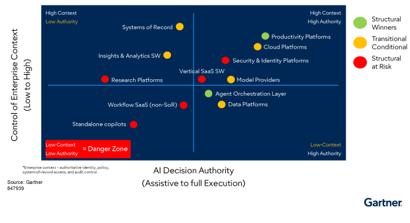 По прогнозу Gartner, к 2030 году компании-разработчики ПО, которые будут просто «накладывать» ИИ на устаревшие системы вместо их глубокой переработки под агентную модель, столкнутся с падением маржинальности до 80%.
