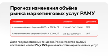 По словам эксперта, применение новой методологии стало точкой переоценки отраслевой статистики: теперь рынок имеет выверенную базу для корректной динамики и отслеживания реальных изменений в будущем: «Например, по прогнозам аналитиков, оборот рынка маркетинговых услуг в 2026 году вырастет на 18% (до 270,9 млрд руб.), при этом ожидаемая инфляция в индустрии составит 17,9%».