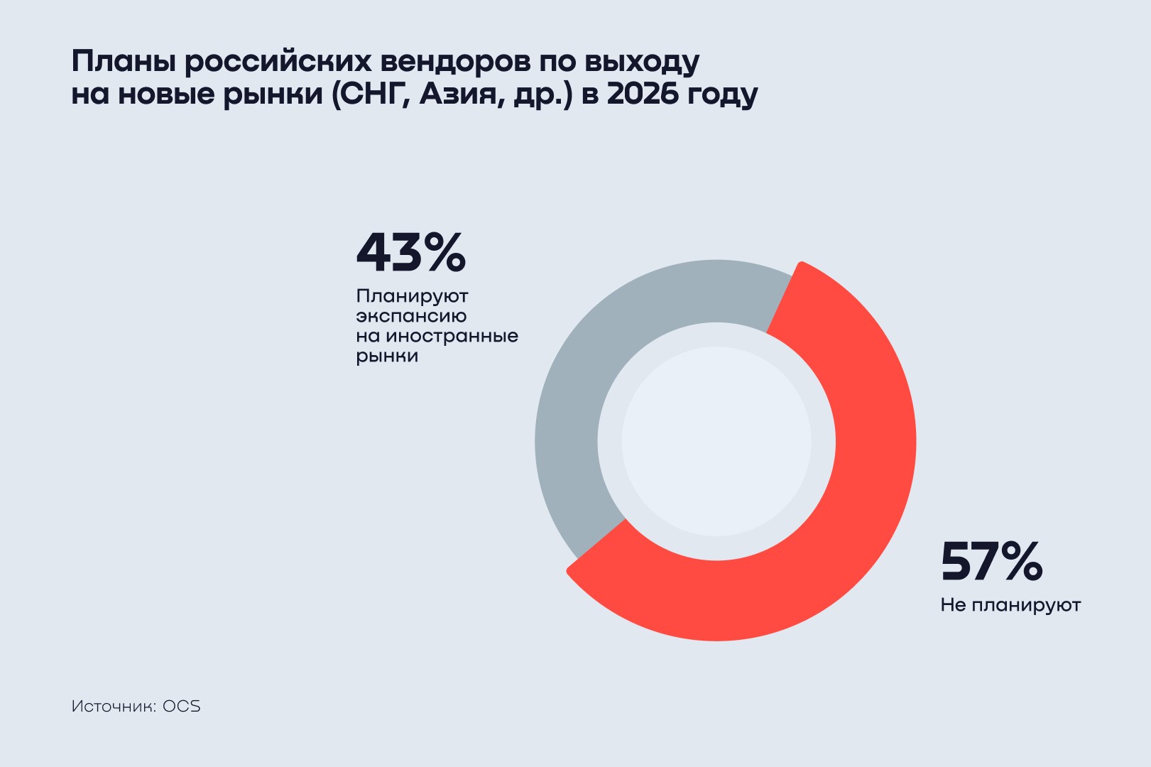 В 2026 году многие российские вендоры ПО ставят своей ключевой целью поиск «новых денег». Организации намерены не только развивать дополнительные способы монетизации, но и выходить на иностранные рынки — о таких планах сообщили 43% респондентов. «Большое количество российских разработчиков софта сегодня ищут дополнительные источники дохода. Очевидное решение — осваивать новые рынки, развивать модели монетизации. И то, и другое требует от ИТ-компаний инвестиций: они должны внедрять передовые или востребованные технологии в свои текущие продукты и расширять ассортимент. И, как мы видим из результатов опроса OCS, вендоры сконцентрировали свои усилия на достижении этих целей до конца 2026 года», — заключила Ольга Скулова. (рис. 2)