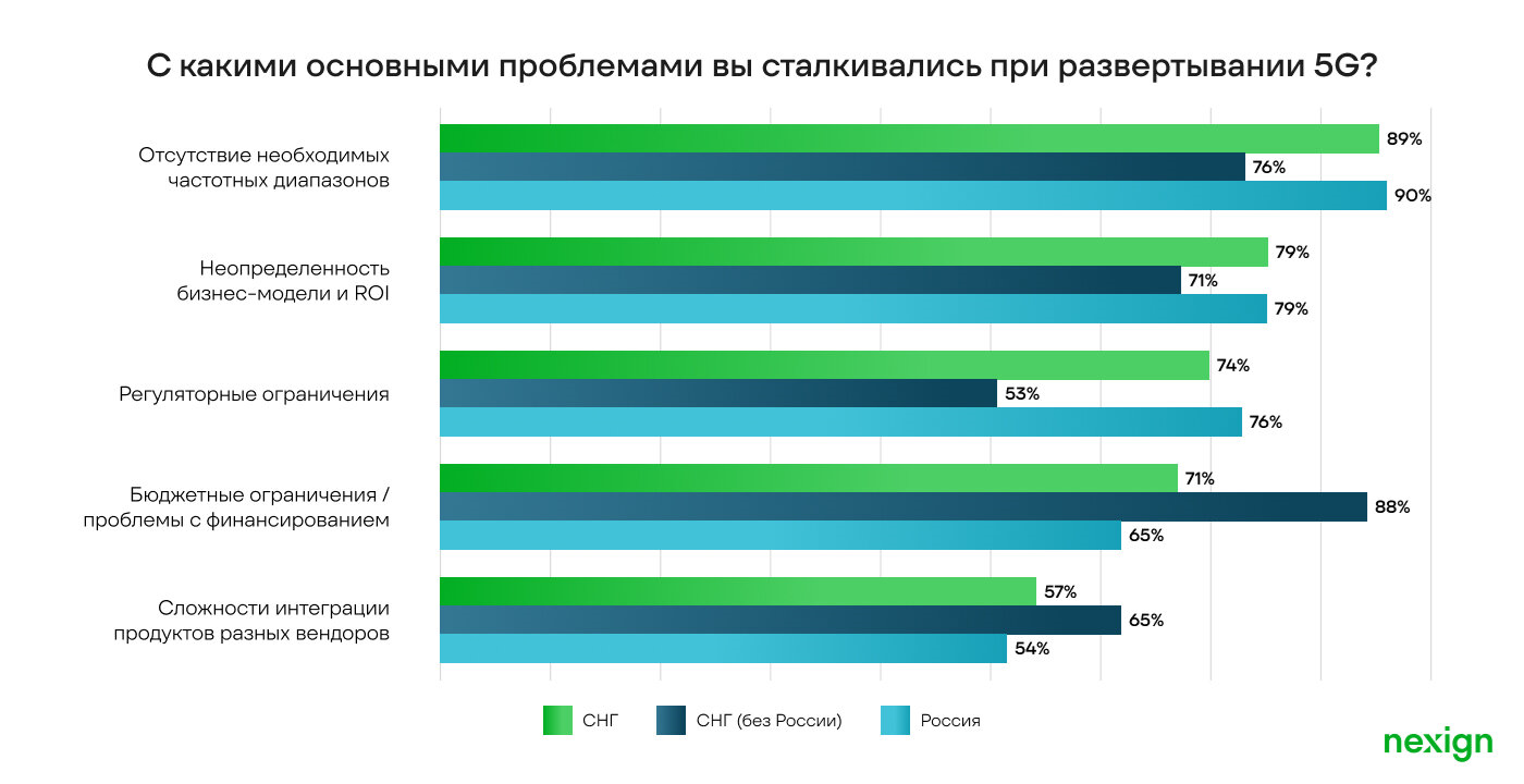 Помимо нехватки частот, тормозящими факторами участников рынка России и СНГ называют отложенный ROI и неопределенность бизнес-модели (почти 80%): массовый пользователь не готов платить существенно больше за прирост скорости по сравнению с LTE, а в корпоративном секторе спрос на 5G еще не оформился в конкретные сервисы и бизнес-модели. «Узким местом» также считают регуляторику (74%) и бюджетные ограничения/проблемы с финансированием (71%). Высокая стоимость заемных средств в большинстве стран СНГ делает проекты с длительной окупаемостью менее привлекательными для инвестиций, вынуждая операторов пересматривать планы капитальных затрат в пользу более точечных запусков.