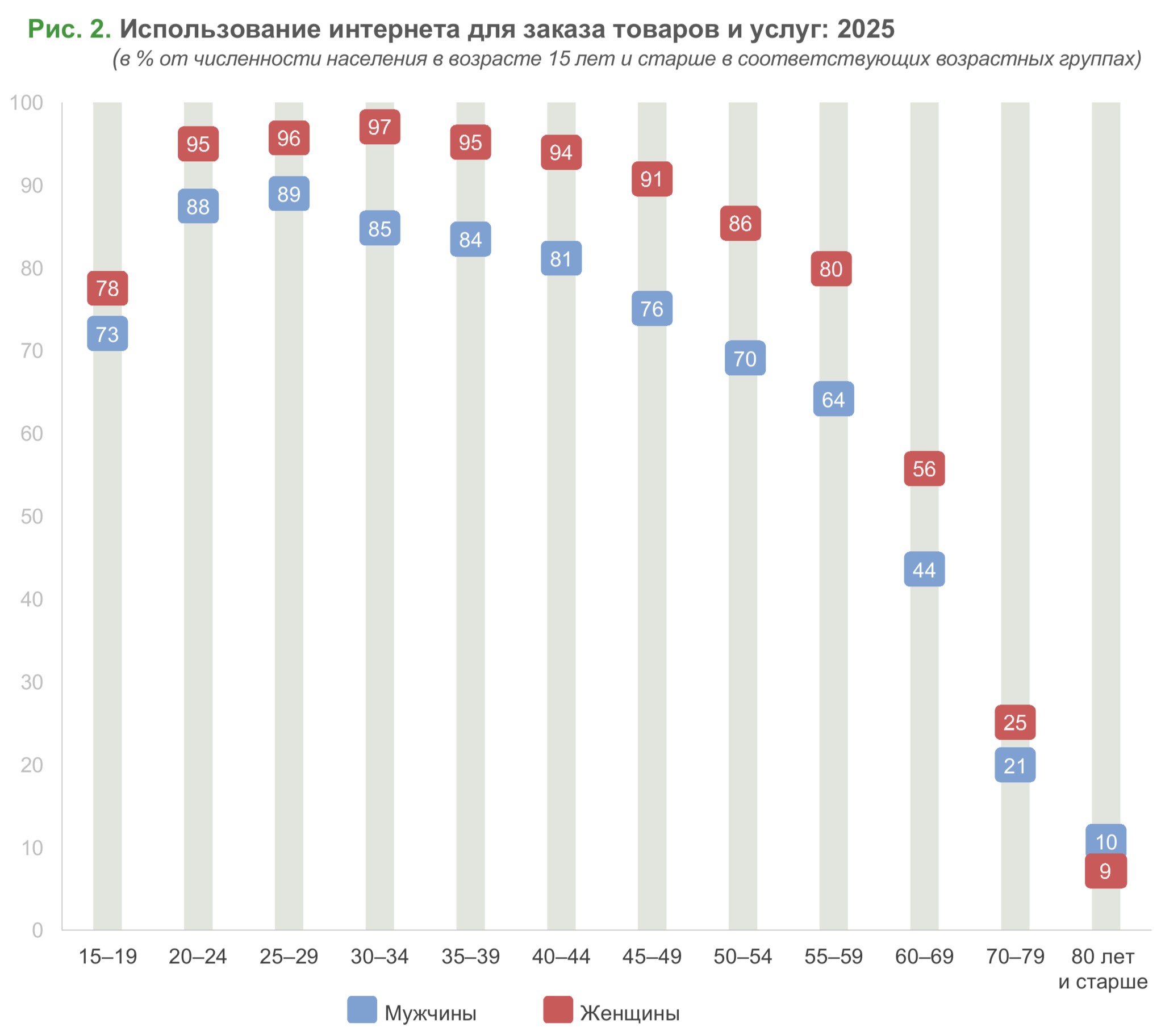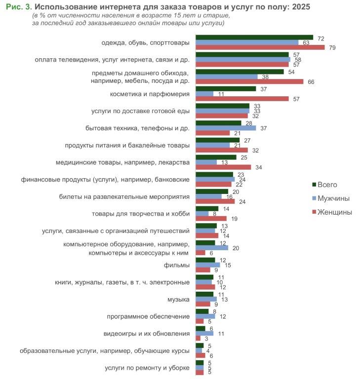 Женщины в целом больше привержены онлайн-шопингу, чем мужчины: в 2025 г. 73% против 68%. Влияние этого фактора прослеживается почти во всех возрастных группах, кроме самой пожилой (80 лет и старше) (рис. 2). Далее изучим подробнее гендерные различия, которые проявляются при выборе в интернете тех или иных видов товаров и услуг.