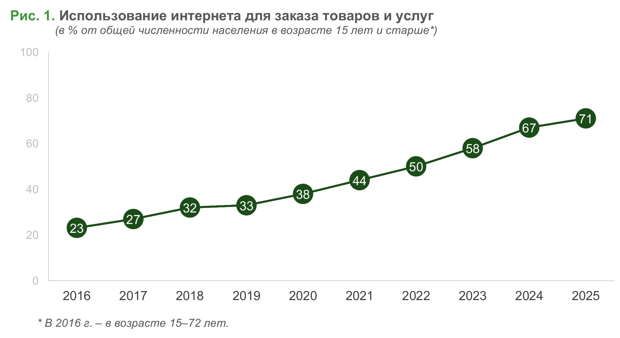 Еще десять лет назад лишь около четверти наших сограждан (23%) совершали покупки в Сети. Во время пандемии онлайн-торговля получила дополнительный импульс, который затем трансформировался в устойчивый рост уже за счет других стимулов, в том числе развития инфраструктуры маркетплейсов. В 2025 г. что-либо онлайн покупали уже 71% россиян, что на 4 п. п. больше, чем годом ранее (рис. 1).