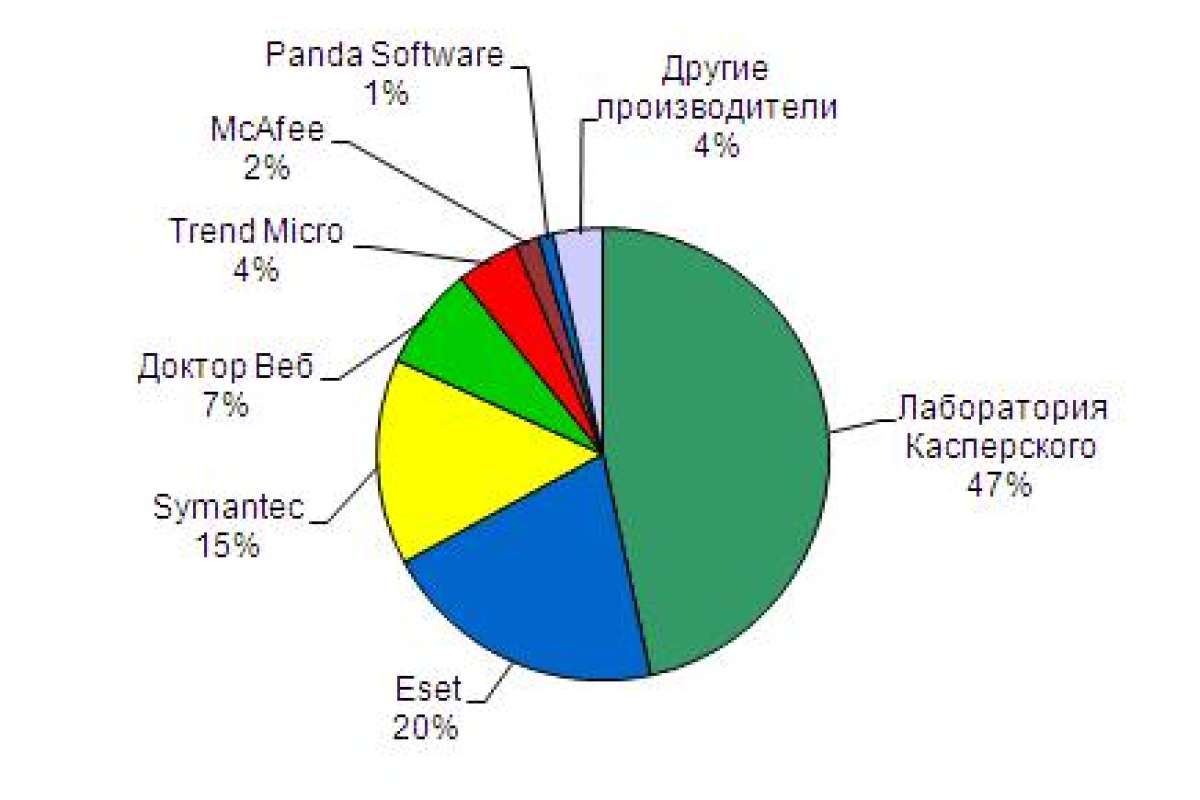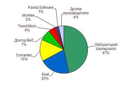 Бесспорное лидерство на российском рынке уже в течение многих лет удерживает «Лаборатория Касперского». Объем продаж компании в 2008 году составил 98 млн. долл., что соответствует доле рынка 46,6%. Такие результаты связаны в первую очередь с успехами компании в секторе розничных продаж: в 2008 году «Лаборатория» представила новую линейку продуктов для домашних пользователей с индексом 2009. Хорошие результаты достигнуты также в сегменте малого и среднего бизнеса и в госструктурах.