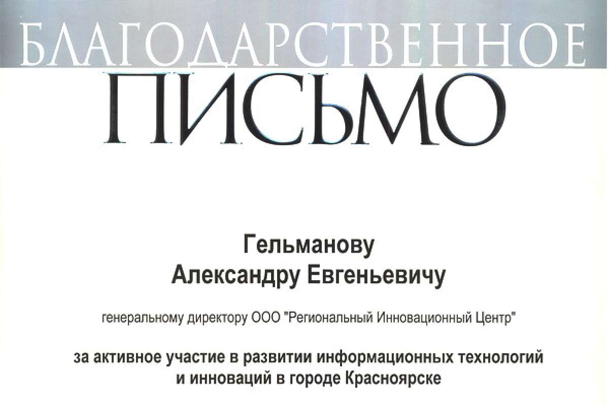 Благодарность за вклад в развитие ИТ главой Красноярска объявлена впервые, что говорит о значительных заслугах Александра Гельманова и о приоритетности этого направления для развития города и края.