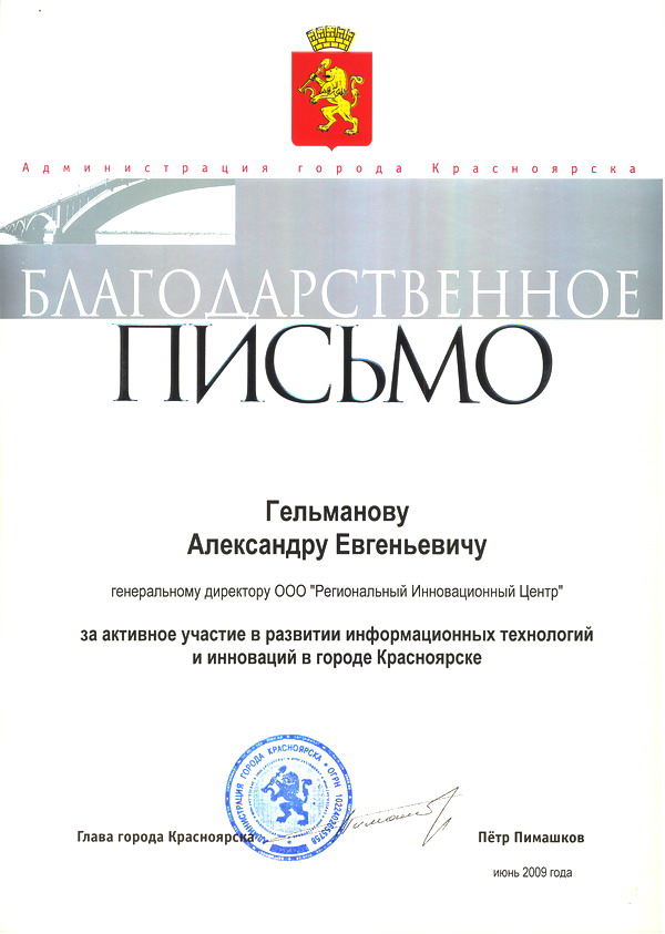 Мэр Красноярска Петр Пимашков от имени городской администрации выразил благодарность Региональному инновационному центру и его генеральному директору Александру Гельманову за активное участие в развитии информационных технологий и инноваций в городе.Напомним, РИЦ входит в состав красноярского Кластера информационных технологий» (КИТ), а Александр Гельманов является его координатором. Основная цель кластера - создание условий для интенсивного формирования и развития инновационных предприятий, а также продвижение инновационных разработок и решений на российский и зарубежный рынки.