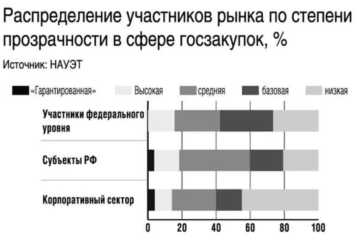 Из ста крупнейших заказчиков корпоративного сегмента «гарантированную прозрачность» проявили 4 компании («Газпромнефть», МТС, «Почта России», «Комстар-ОТС») «высокую» ─ 10, «среднюю» ─ 26, «базовую» ─ 15, «низкую» ─ 45. Как отмечают эксперты НАУЭТ, в корпоративном сегменте наилучшие показатели прозрачности наблюдались у телекоммуникационных компаний. Однако и здесь не обошлось без сюрпризов – так, «Связьинвест» занял «второе место с конца», но при этом его «дочки» («Уралсвязьинформ», «Ростелеком», «Центртелеком», «Волгателеком» и «Сибирьтелеком») попали в категорию «высокая прозрачность». Можно заметить, что сейчас корпоративные заказчики не обязаны соблюдать правила закона о госзакупках, но правительством одобрена концепция законопроекта, который распространит эти правила на естественные монополии.