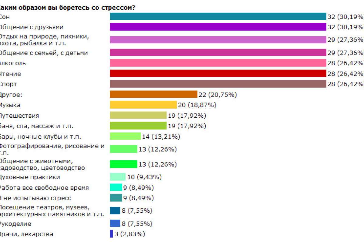 Почти столь же эффективными (по 27,36% ответов) способами восстановить душевное равновесие были названы «отдых на природе, рыбалка, пикники и т.п.» и «общение с семьей», а также (по 26,42%) – чтение и спорт. К слову, снимают стресс алкоголем тоже 26,42% респондентов.