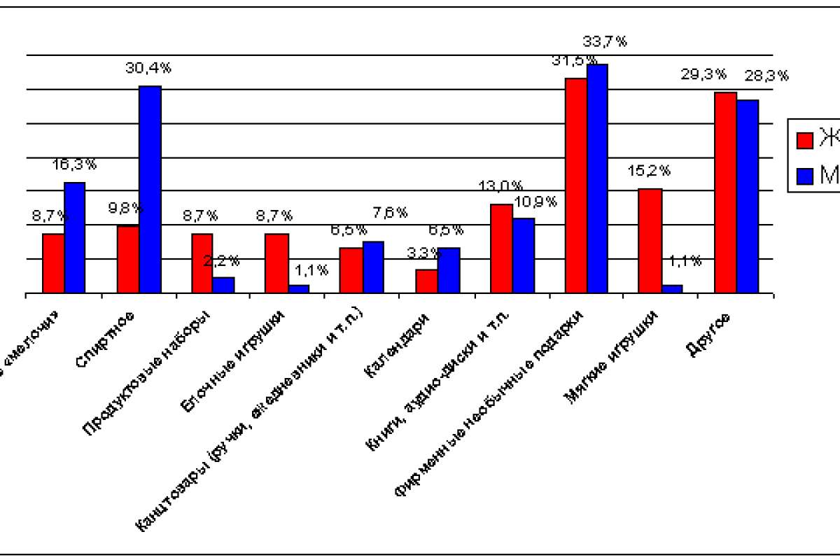 Самыми непопулярными подарками наши респонденты – как мужчины, так и женщины - считают календари (женщины - 3,3%, мужчины - 6,5%) и канцтовары (женщины – 6,5%, мужчины – 7,6%). Заметим, что календари и канцтовары (ежедневники, ручки и т.п.) мы с вами как раз чаще всего и получаем в подарок от бизнес-партнеров… Мужчины вряд ли порадуются мягким игрушкам, елочным украшениям и продуктовым наборам.