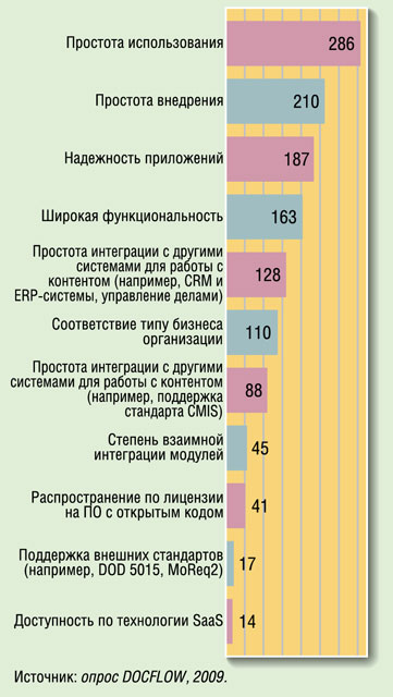 Финансовые и организационные аспекты являются самыми сложными при решении вопросов управления документооборотом в организациях. Среди основных трудностей были названы обоснование инвестиций, привлечение совета директоров и сотрудников, определение требований. При выборе же СЭД решающую роль играют простота ее внедрения и использования, а также надежность (рис. 4).