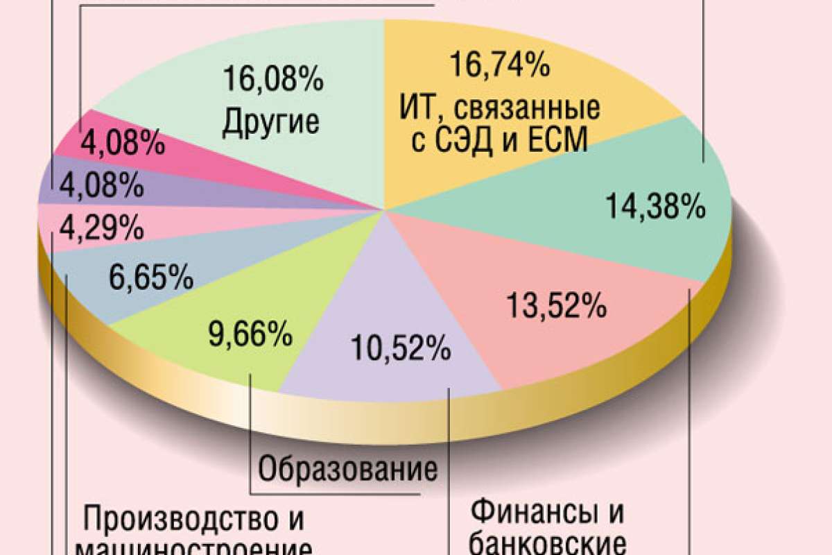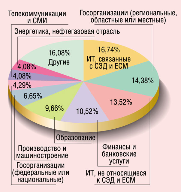 Структура респондентов позволяет оценить интерес к теме использования СЭД разных категорий участников рынка (рис. 1). Почти треть из них относится к ИТ-поставщикам, из которой более половины занимаются предоставлением решений и услуг в сфере управления документами и информацией. Почти пятая часть опрошенных приходится на государственный сектор, причем подавляющую долю (14,4%) составляют региональные и местные организации. Среди коммерческих потребителей лидирует банковско-финансовый сектор (10,5%), за ним с небольшим отрывом идет сфера образования (9,7%). По численности сотрудников организации распределились следующим образом: до 100 человек — 28%, от 100 до 500 — 26%, от 500 до 1000 — 16,5%, свыше 1000 — 29,5%. С точки зрения персональной специализации 42% опрошенных причислили себя к лагерю ИТ-профессионалов, 22% — к специалистами по управлению документами, 16% являются руководителями отдельных направлений, 5% — топ-менеджерами компаний.